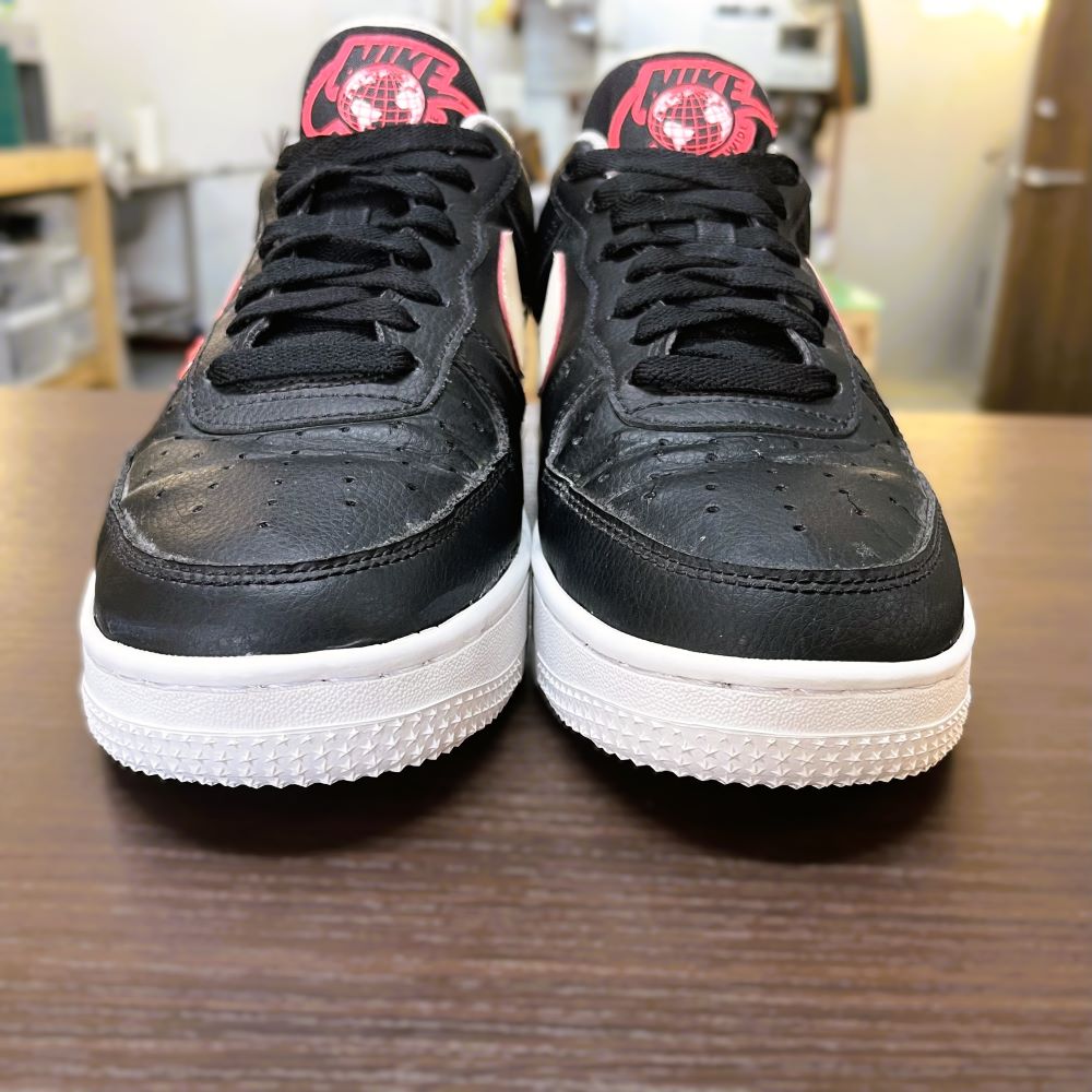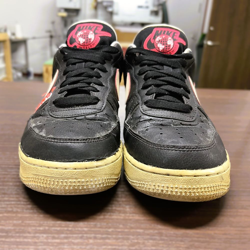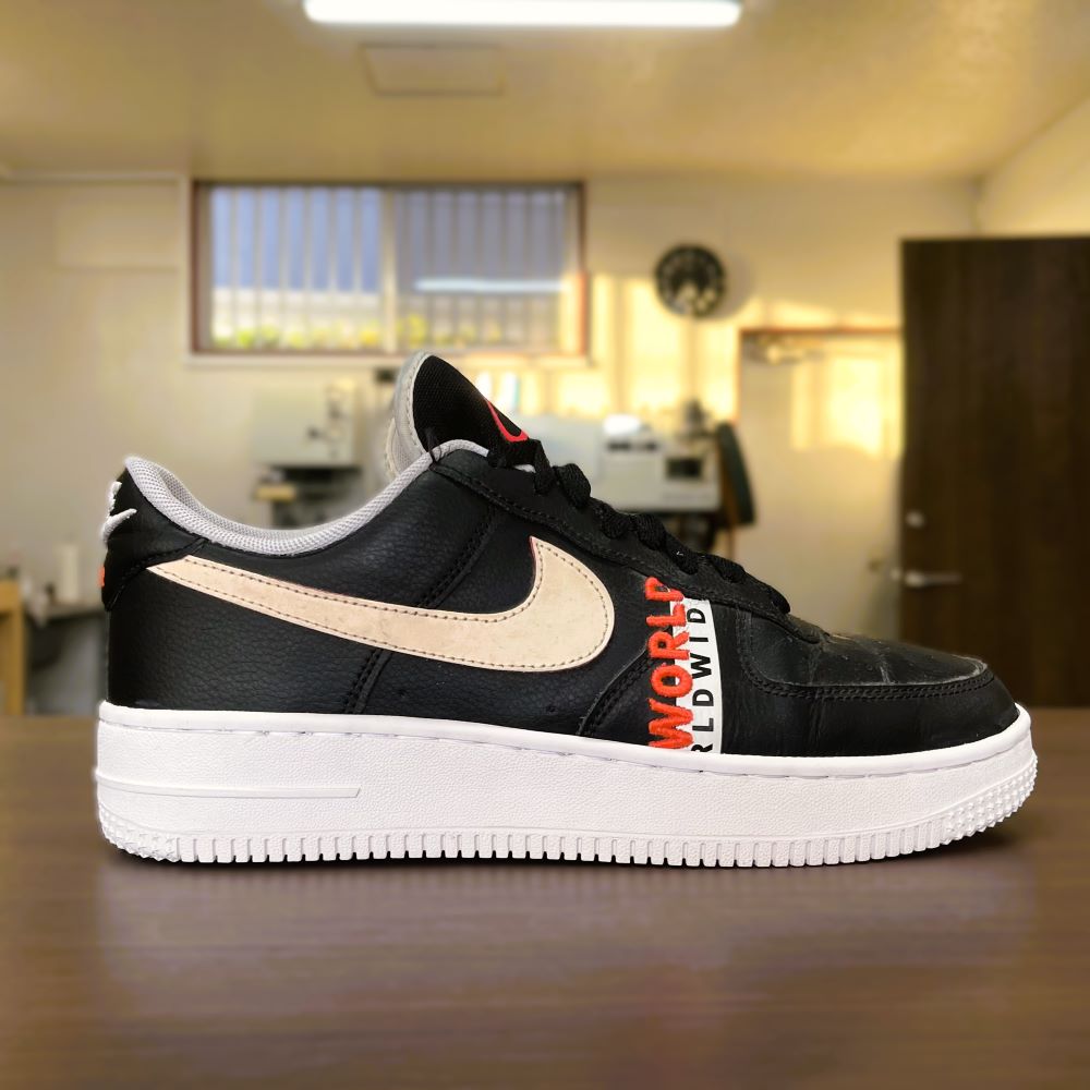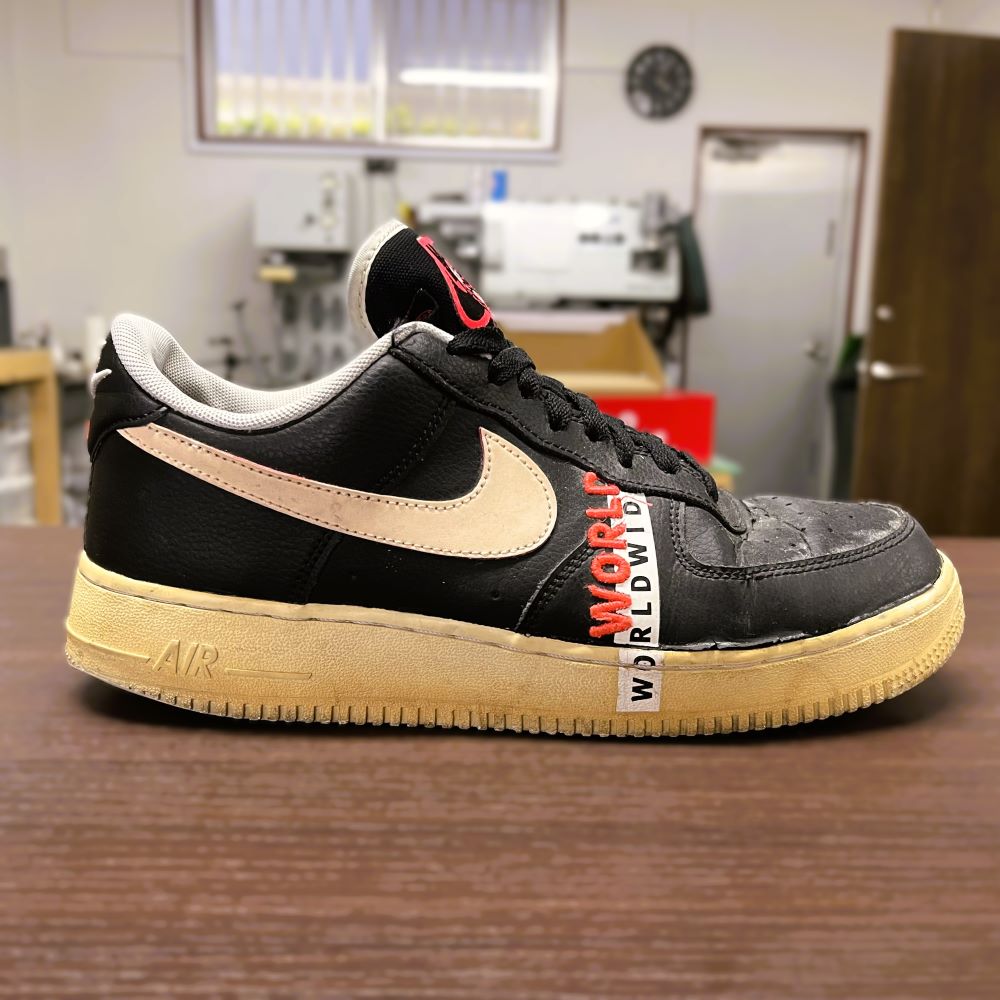今回は、NIKE AIR FORCE 1 07 LV8 WORLDWIDEのソールが劣化してしまったため、オールソール(ソール交換)修理を行いました。