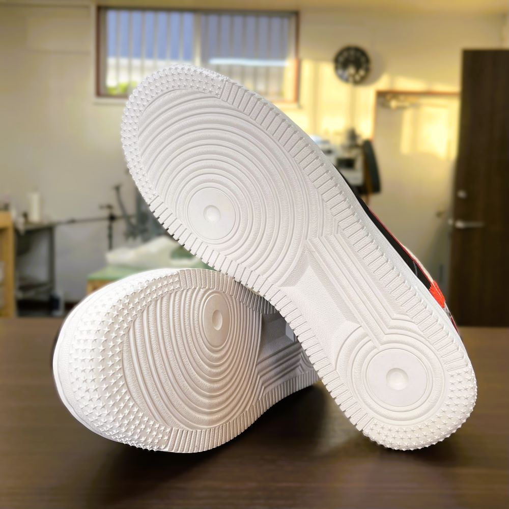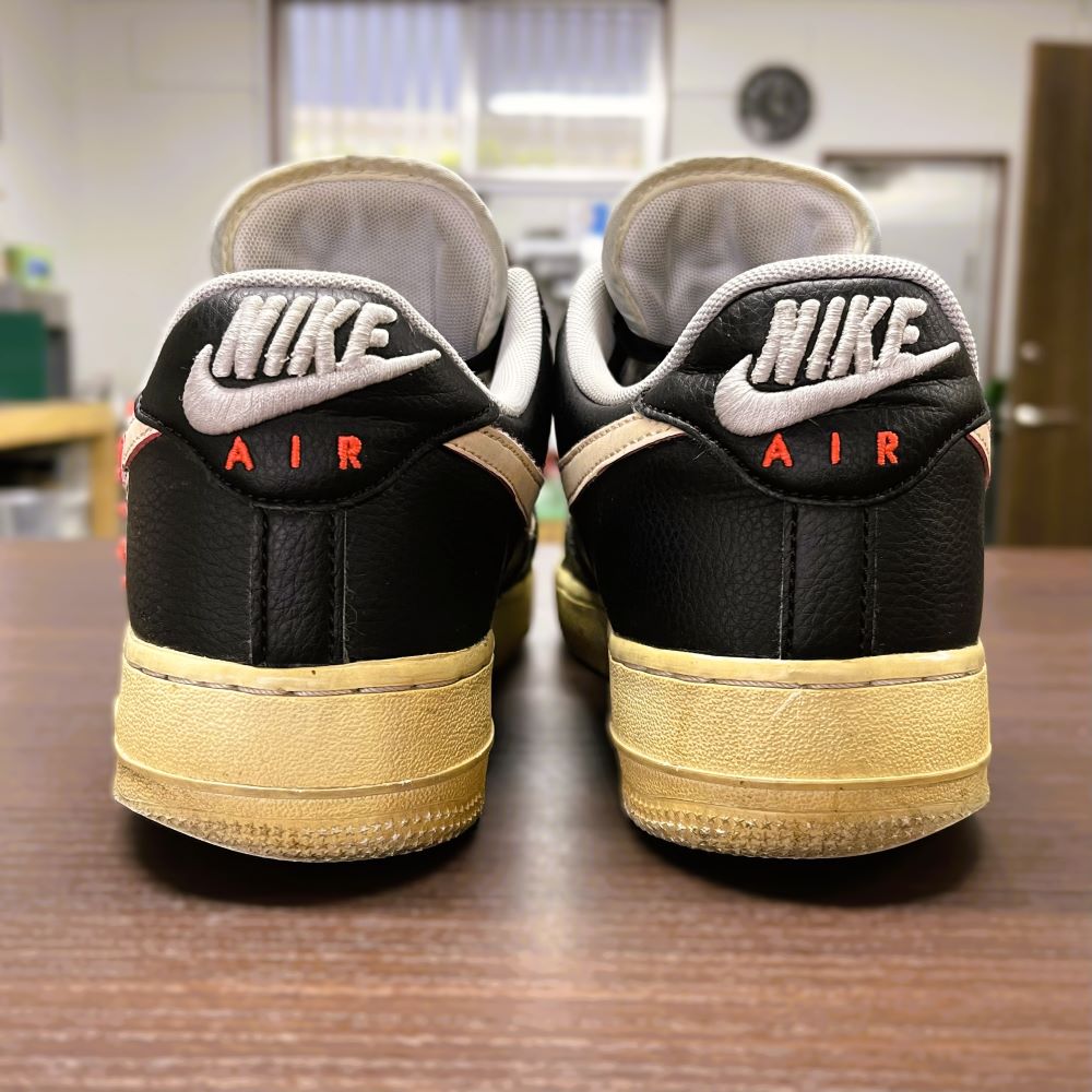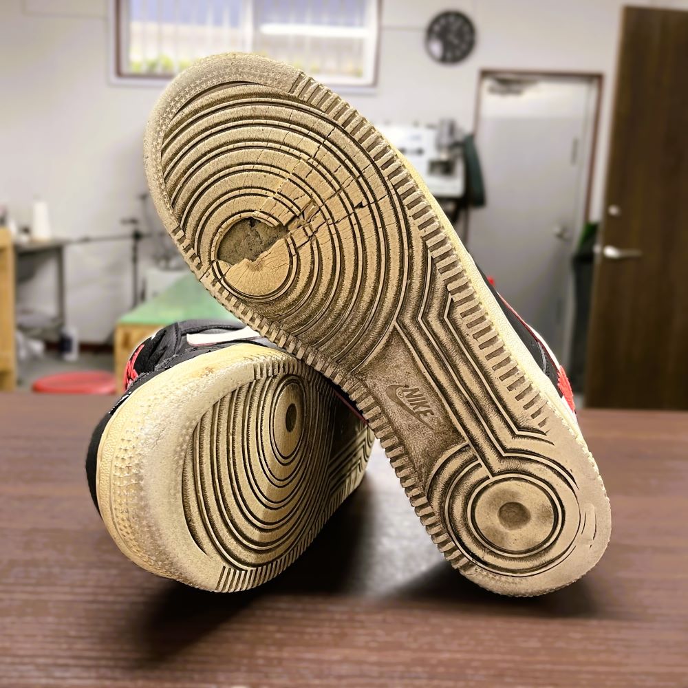 ナイキの定番スニーカー「エアフォース1」は、長く履いていたり保管したままにしていると、ソールの硬化やベタつき(加水分解)が起こりやすいモデルです。ソールの剥がれや割れが発生し、このままでは着用が難しい状態になることもあります。