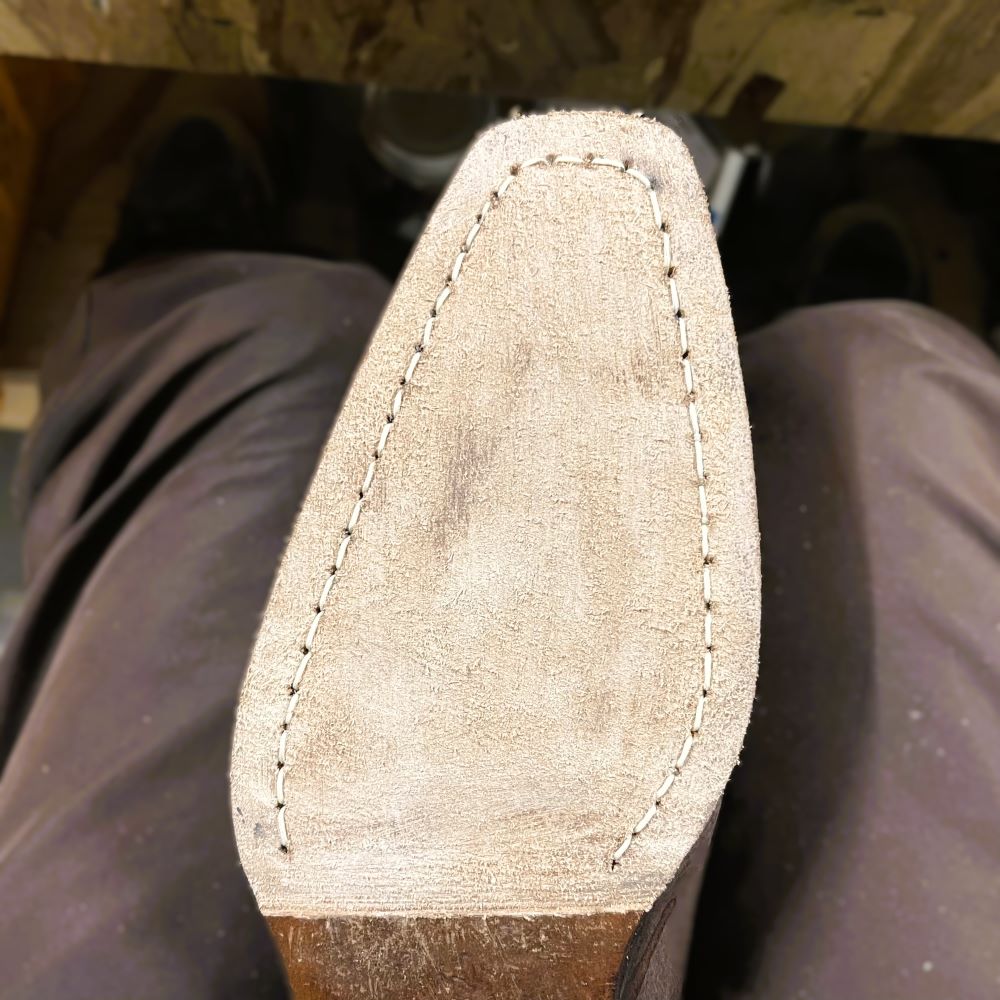 まず既存のハーフソールを一度取り外し、靴本体のソールをしっかり縫い直し。