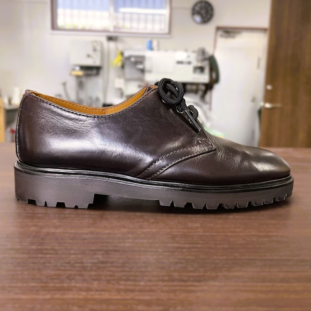 今回は、ソールの劣化と履き口の破れが見られたため、オールソール交換とすべり革交換を行いました。