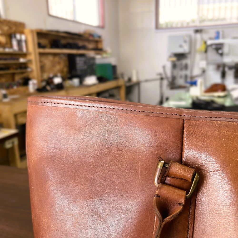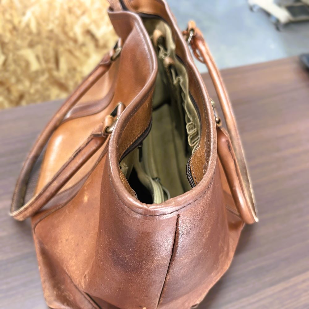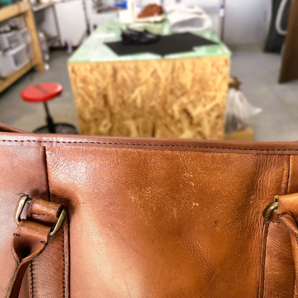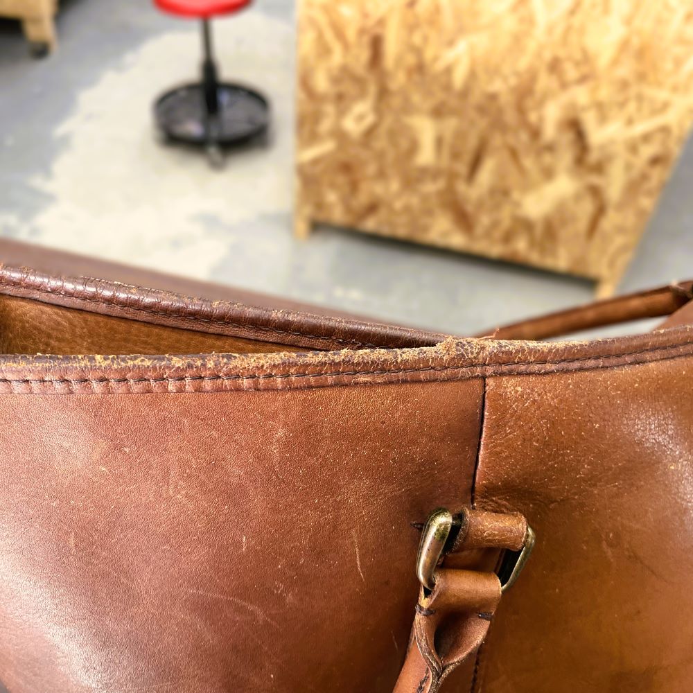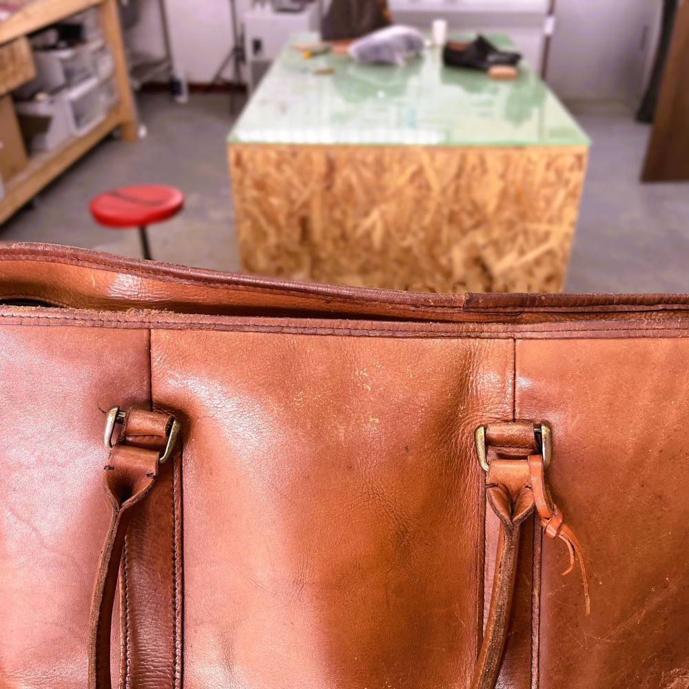 今回ご依頼のバッグはレザーのトートバッグで、使い込むことで風合いが増す一方、特に口周り(上部の縁部分)は手が触れる回数が多く、摩擦や乾燥の影響を受けやすい箇所です。