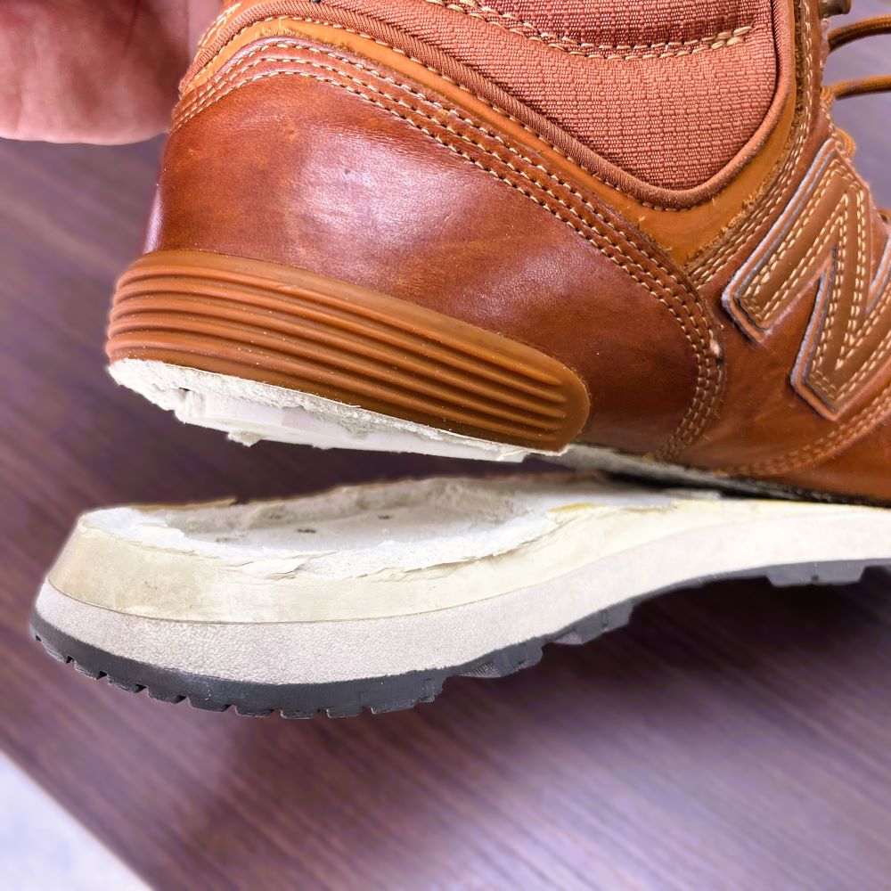 ニューバランス574はミッドソールにウレタン素材が使用されており、年数が経過すると素材自体が脆くなります。その結果、歩行時の荷重に耐えられずソールが外れてしまいます。