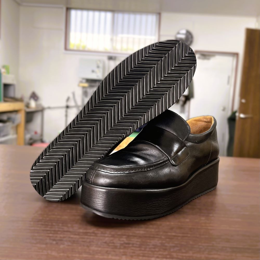 劣化したウェッジソールを取り外した後、新たにソールを一から作製し、元のシルエットを意識しながら形状を整えます。さらに外周には革を巻き直すことで見た目を整え、最後にアウトソールを貼り付けて仕上げます。