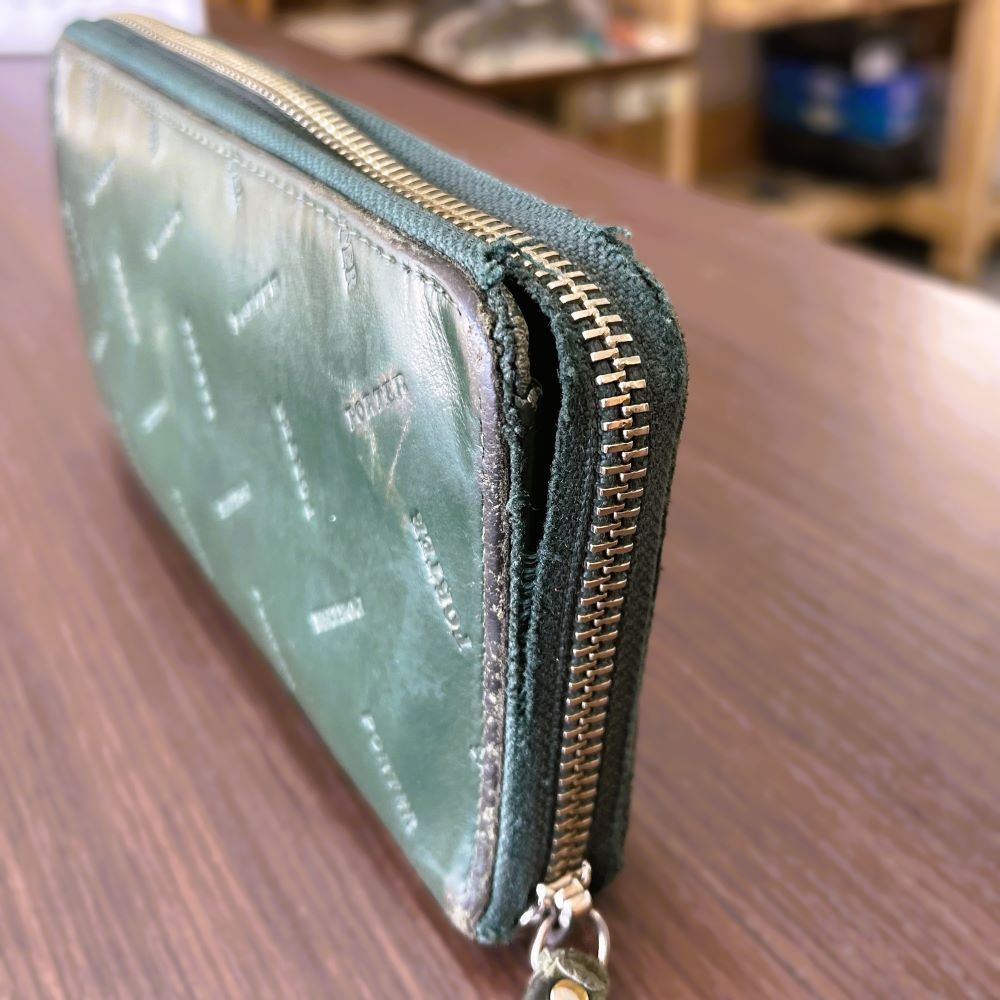 PORTER(ポーター) 長財布/ラウンドファスナー交換 2026 1/24 BLOG PORTER(ポーター) ファスナー 財布 2026年1月24日 ファスナーの生地が切れている状態です。 ファスナーの生地が切れてしまっている場合、部分的な修理はできないため、引手は流用し、ファスナー本体とスライダーを新しく交換いたします。 こちらが仕上がりです。 BLOG PORTER(ポーター) ファスナー 財布