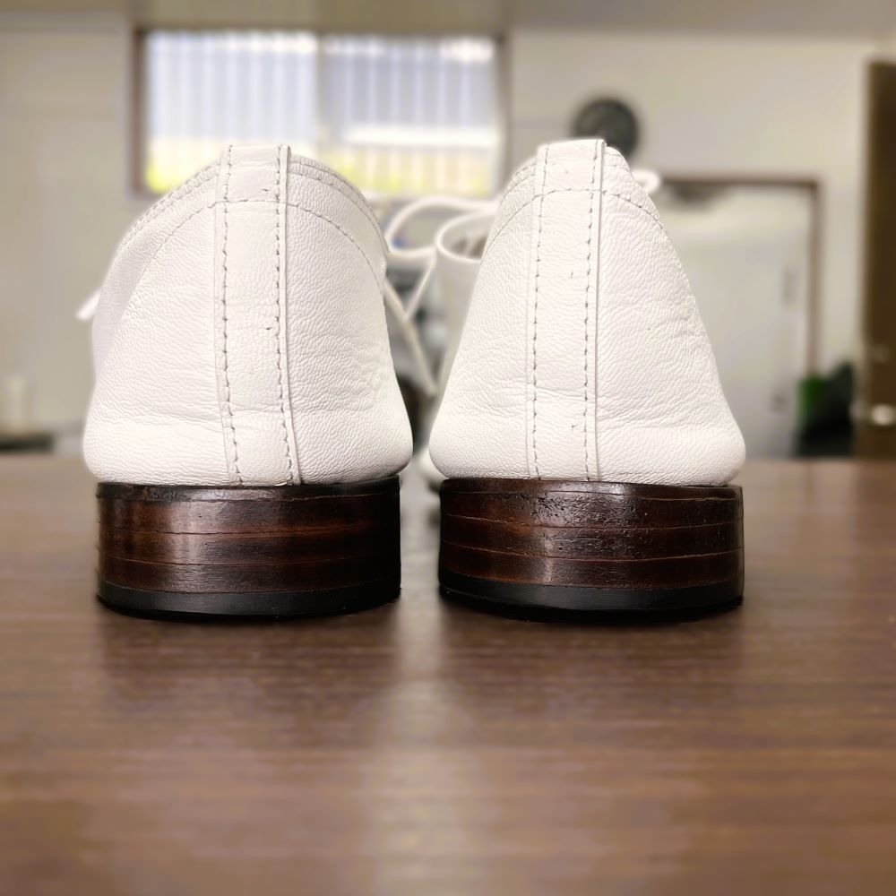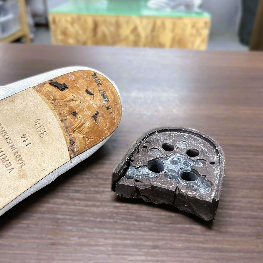 今回はレザーのソールをラバーで補強し、劣化したヒールは元の形に合わせて作製・取り付けを行います。